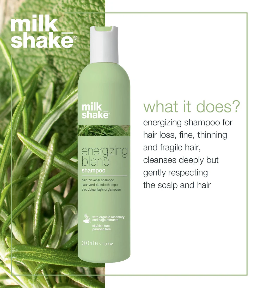 milk_shake energizing blend shampoo is for fine, thinning and fragile hair, cleanses deeply but gently while respecting the scalp and hair. The natural powers in organic rosemary, sage and fioravanti balm extract purifies hair while stimulating the scalp’s micro-circulation to create an optimal environment for new hair growth. The blend of botanical extracts and special conditioners invigorates the hair stem and gives softness. Panthenol provides more density to the hair, and essential oils and eucalyptus instil a pleasant energizing feeling, leaving the scalp refreshed.